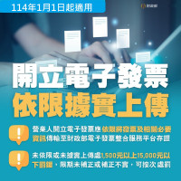 114年1月1日起,開立電子發票相關資訊應 依規定時限,據實傳輸至財政部電子發票整合服務平台存 證,違反上開規定除通知限期補正外,並得處新臺幣1,500 元以上15,000元以下罰鍰,詳如附件。